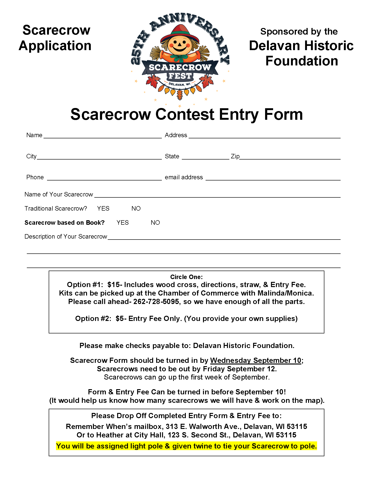Businesses, Organizations, and individuals can enter our Scarecrow Contest. Our Scarecrow Walk will begin in early September. Two options for submission.